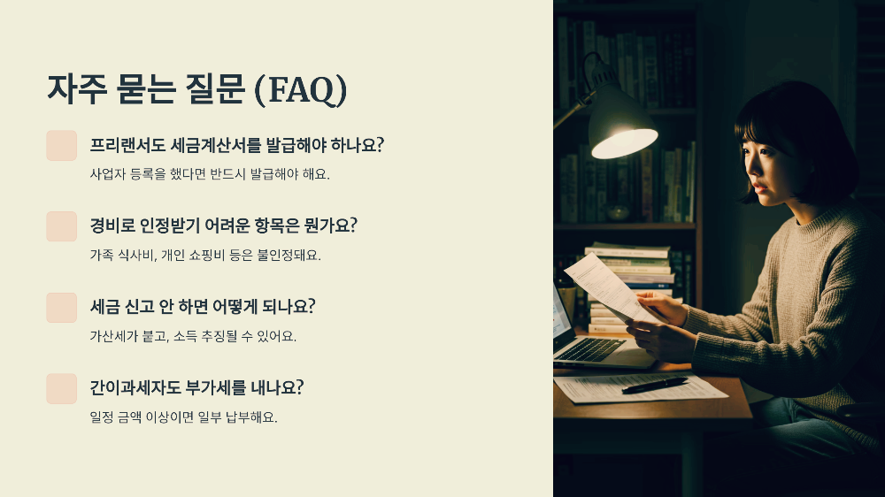 프리랜서가 사업자 등록을 하면 부가가치세(VAT)를 고려해야 해요. 연매출이 8,000만 원 이상이면 일반과세자, 그 이하면 간이과세자로 구분되죠. 일반과세자는 세금계산서를 발행하고, 매출과 매입에 대해 VAT를 신고·납부해요.