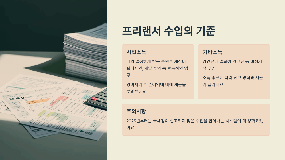 프리랜서가 받는 수입은 '사업소득' 또는 '기타 소득'으로 분류돼요. 소득 종류에 따라 신고 방식과 세율이 달라지기 때문에 어떤 수입인지 정확히 파악하는 게 중요해요. 예를 들어, 강연료나 일회성 원고료는 기타 소득에 해당할 수 있어요.