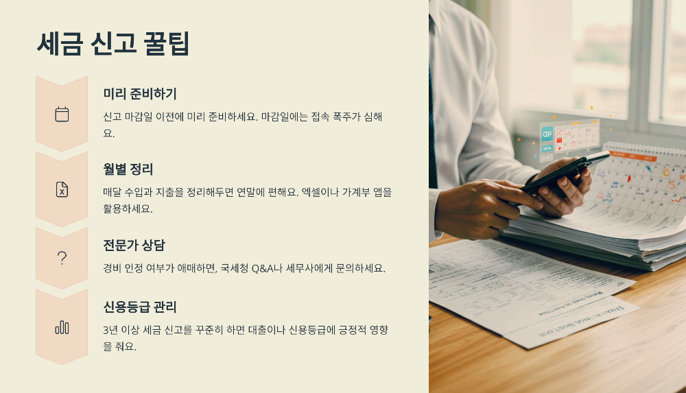 3. 경비 인정 여부가 애매하면, 국세청 홈택스 Q&A 게시판을 활용하거나 세무사에게 직접 문의하는 것도 방법이에요.
