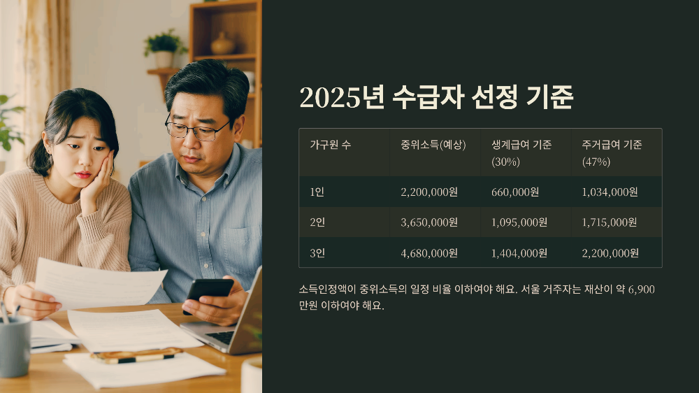 소득뿐 아니라 '재산 기준'도 포함돼요. 서울 거주자 기준 약 6,900만 원 이하의 재산을 보유해야 수급자 자격이 유지된답니다. 지역별로 차이가 있어요.