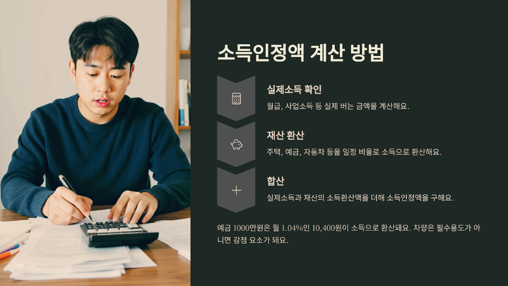 재산의 소득환산율은 주택, 금융재산, 자동차 등에 따라 다르게 적용돼요. 예금 1000만 원이면 월 1.04%인 10,400원이 매달 소득으로 잡히는 식이죠.