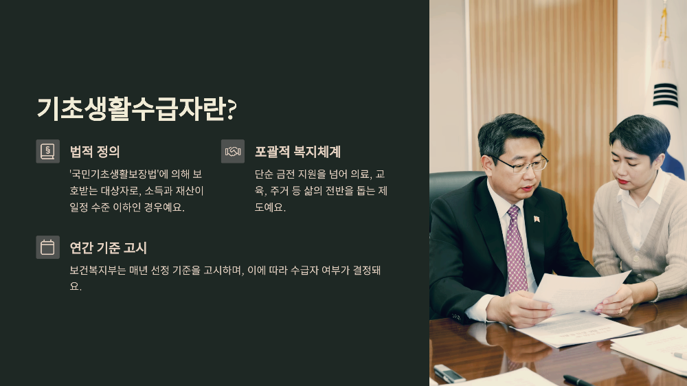 기초생활수급자는 국가의 복지 핵심 대상자이기 때문에, 자신이 해당 조건에 맞는지 먼저 정확히 알아보는 것이 중요해요.