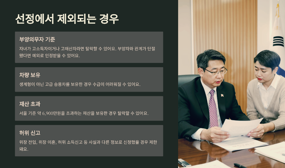 가장 대표적인 예외는 '부양의무자' 기준이에요. 2025년부터 생계급여, 의료급여에서는 부양의무자 기준이 일부 폐지됐지만, 여전히 일부 급여나 상황에서는 영향을 받을 수 있어요.
