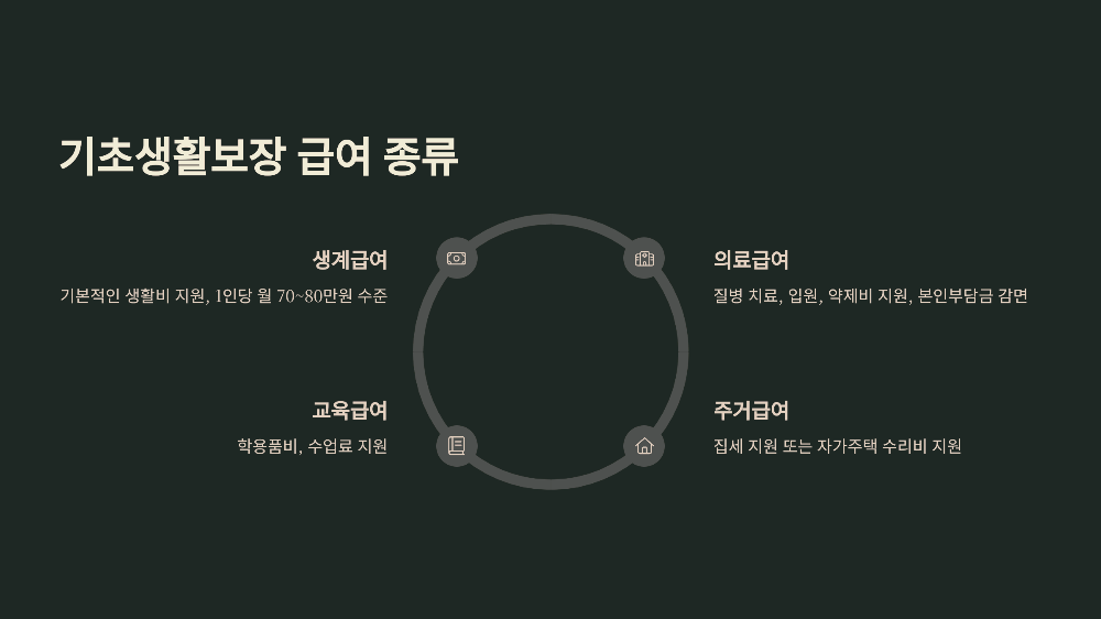 수급자 혜택은 생계급여, 의료급여, 주거급여, 교육급여 네 가지로 구성돼 있으며, 상황에 따라 중복 지원도 가능해요.